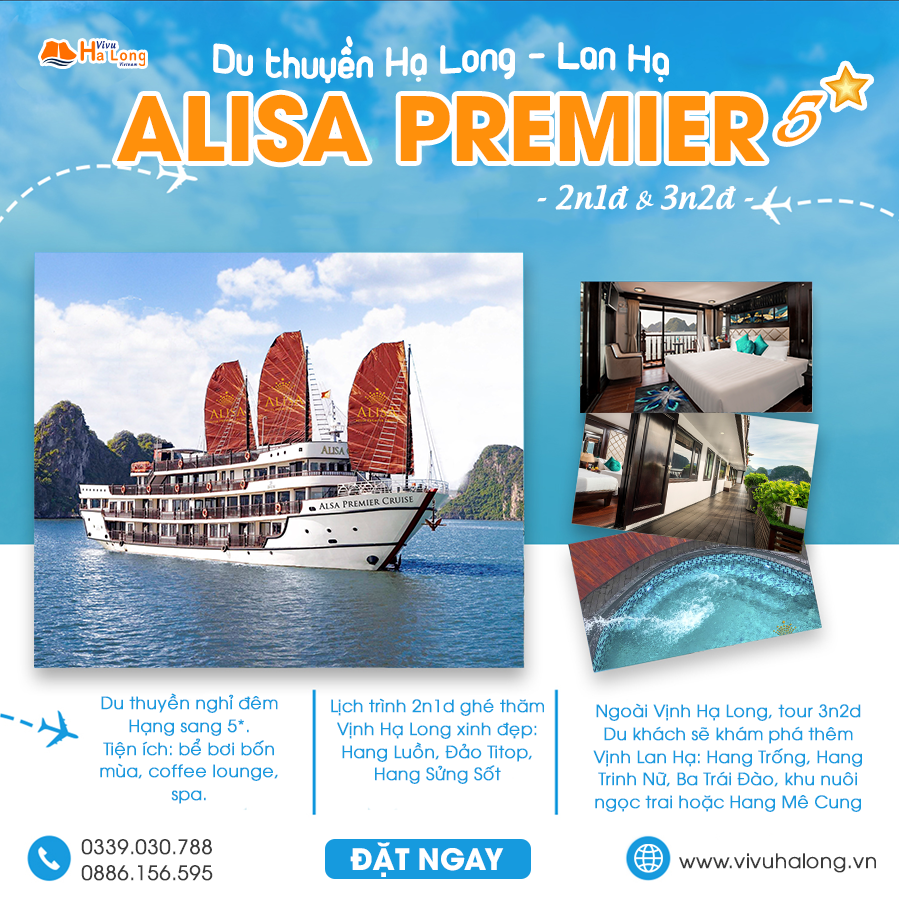 Alisa Premier Cruise – Tour Du thuyền 5 sao Vịnh Hạ Long & Vịnh Lan Hạ qua đêm