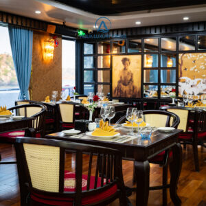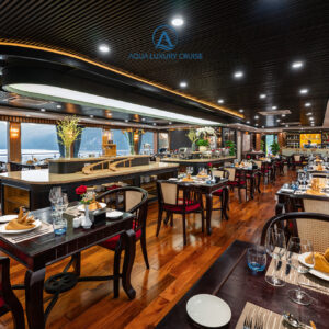 - 19h15: Quý khách thưởng thức bữa tối trong không gian nhà hàng sang trọng cùng các món ăn tinh hoa trên Du thuyền Aqua Luxury