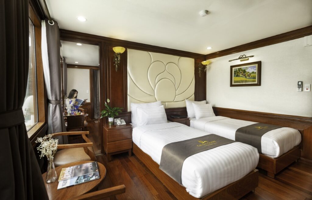 Mỗi du thuyền bao gồm 20 cabins sang trọng và rông rãi, được thiết kế theo phong cách cổ điển Phương Đông. Tất cả nội thất trong phòng đều được làm từ gỗ cao cấp, với gam mầu nâu trầm tạo nên sự ấm cúng, gần gũi với thiên nhiên. Trong phòng được trang bị đầy đủ tiện nghi hiện đại với phòng tắm riêng, có bồn sục cao cấp và cửa sổ lớn phóng tầm nhìn tuyệt đẹp ra vịnh.