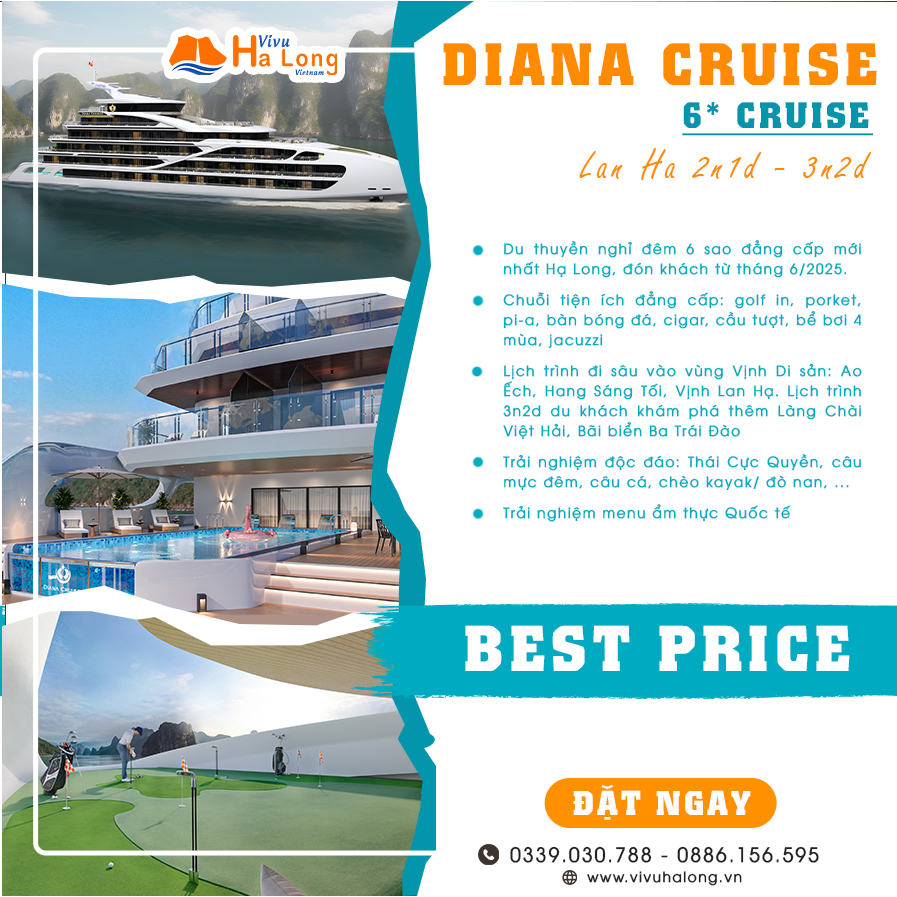 ana cruise là du thuyền 6 sao đầu tiên và lớn nhất vịnh Lan Hạ hiện nay với số lượng lên đến 56 cabin phục vụ cho khoảng từ 200 – 300 du khách ngủ đêm trên cùng một hải trình. Lấy cảm hứng từ những siêu du thuyền sang trọng trên thế giới, Diana cruise hấp dẫn mọi ánh nhìn với phong cách thiết kế hiện đại kết hợp với những đường cắt mềm mại. Được định vị trong phân khúc du thuyền 6 sao nên mọi chi tiết được chăm sóc tỉ mẩn nhằm mang lại những trải nghiệm khó quên nhất đến với khách hàng. Du thuyền được đóng mới và chính thức đi vào hoạt động vào tháng 11/2025.