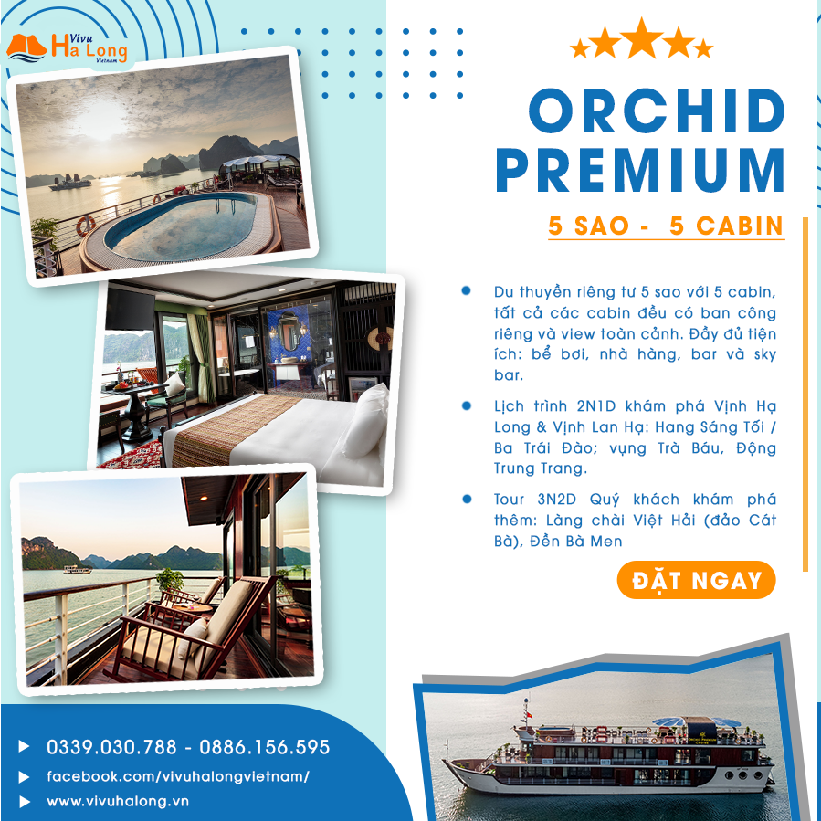 Mang vẻ đẹp kiêu hãnh kết hợp tinh tế giữa nét hoài cổ truyền thống Á Đông và phong thái lịch lãm, sang trọng tân cổ điển Pháp, Orchid Premium là du thuyền lý tưởng cho những trải nghiệm mang tính riêng tư. Được thiết kế chỉ với 5 phòng Suite cực kỳ rộng rãi và lãng mạn, ẩm thực đẳng cấp giao thoa phong vị Á – Âu, bể sục trên sân thượng, piano bar…, Orchid Premium thực sự là một “bản hòa tấu” tuyệt mỹ trên hải trình thưởng ngoạn cửa ngõ Đông Bắc Việt Nam tuyệt sắc.