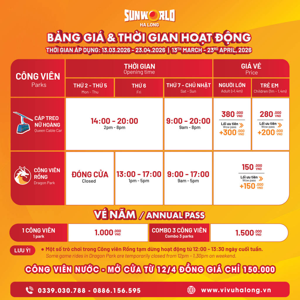 Cập nhật THỜI GIAN HOẠT ĐỘNG VÀ BẢNG GIÁ VÉ SUNWORLD HẠ LONG MỚI NHẤT